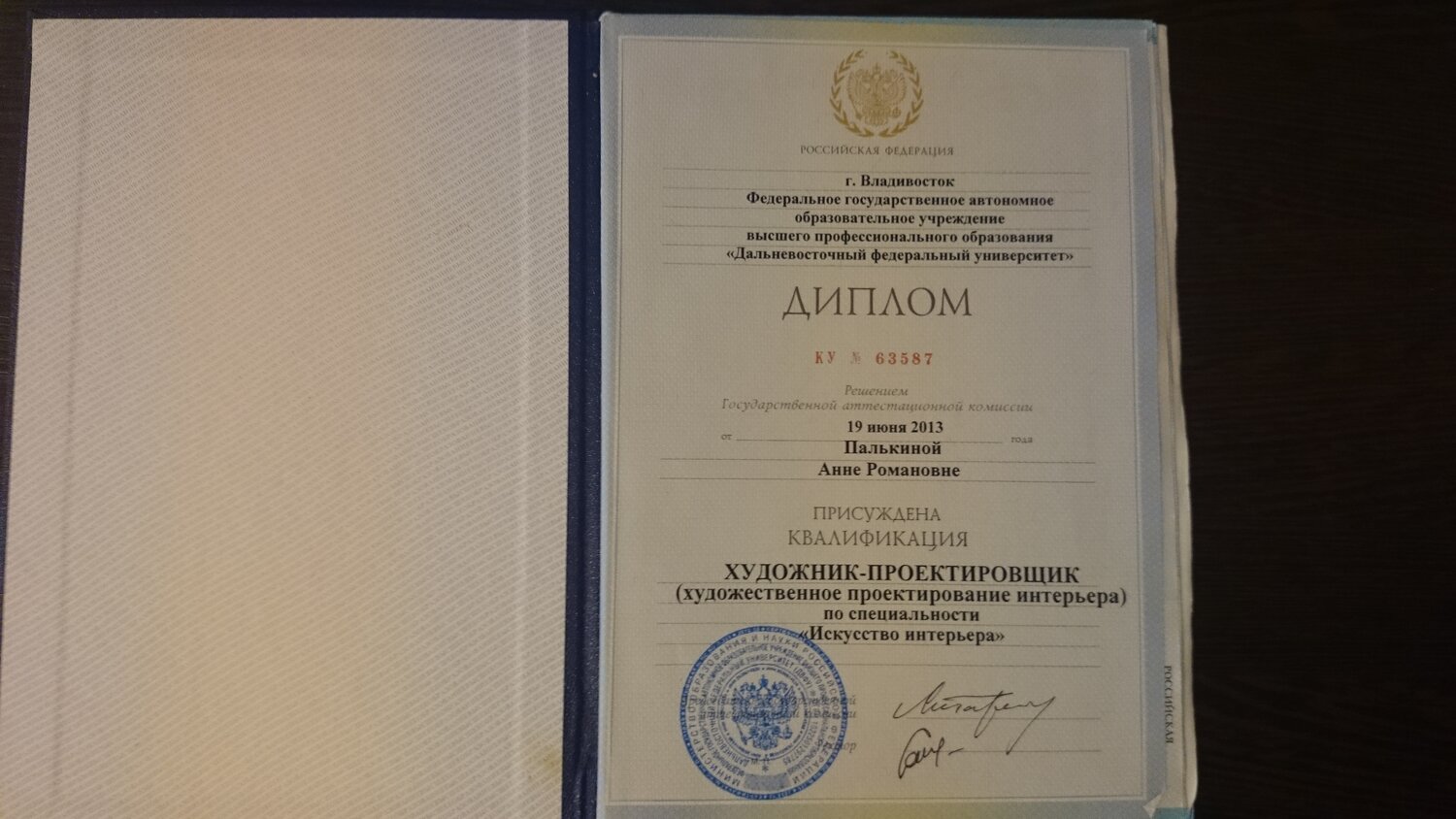 Образование: ДВФУ, факультет Проектирования архитектурной среды и интерьера.,