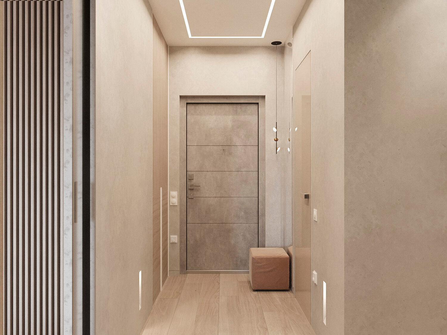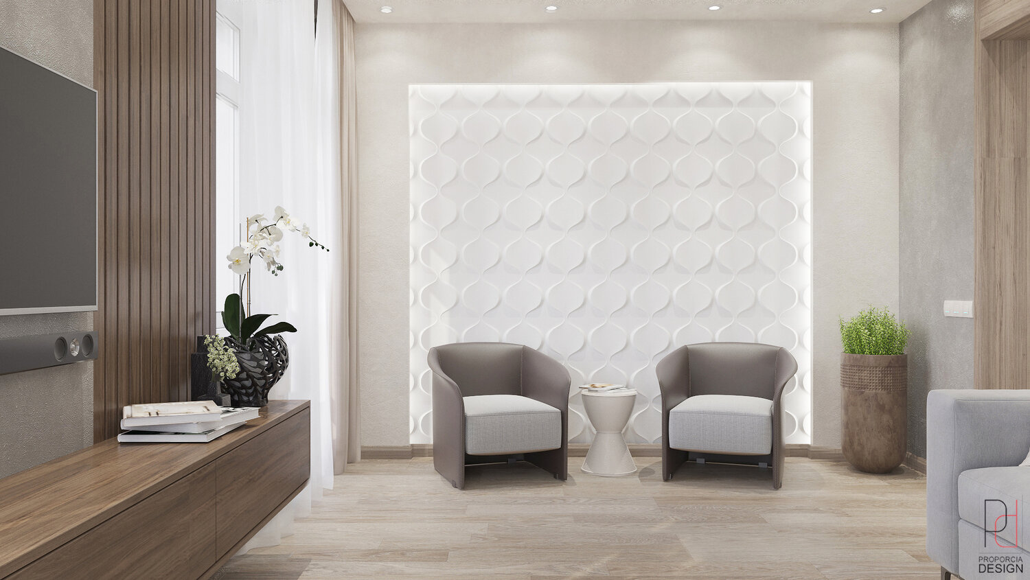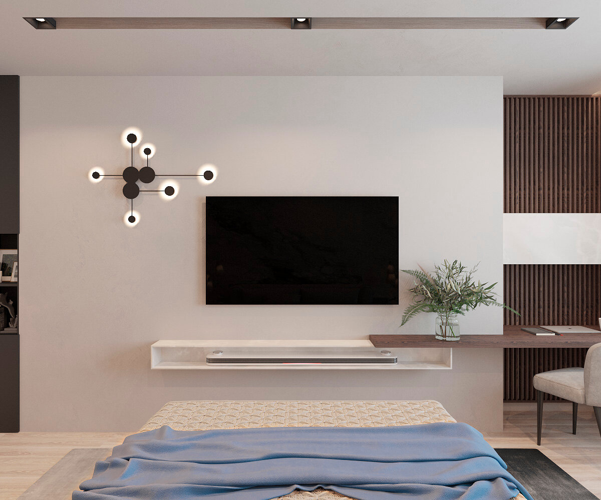 Дизайн-проект квартиры в современном стиле. Задача: создать современный интерьер с элементами неоклассики. Решения: - ровные природные цвета стен и текстуры - для комфортного размещения разных функциональных зон применено минимум отдельно стоящей мебели и максимум встроенной - разнообразный сценарий освещения