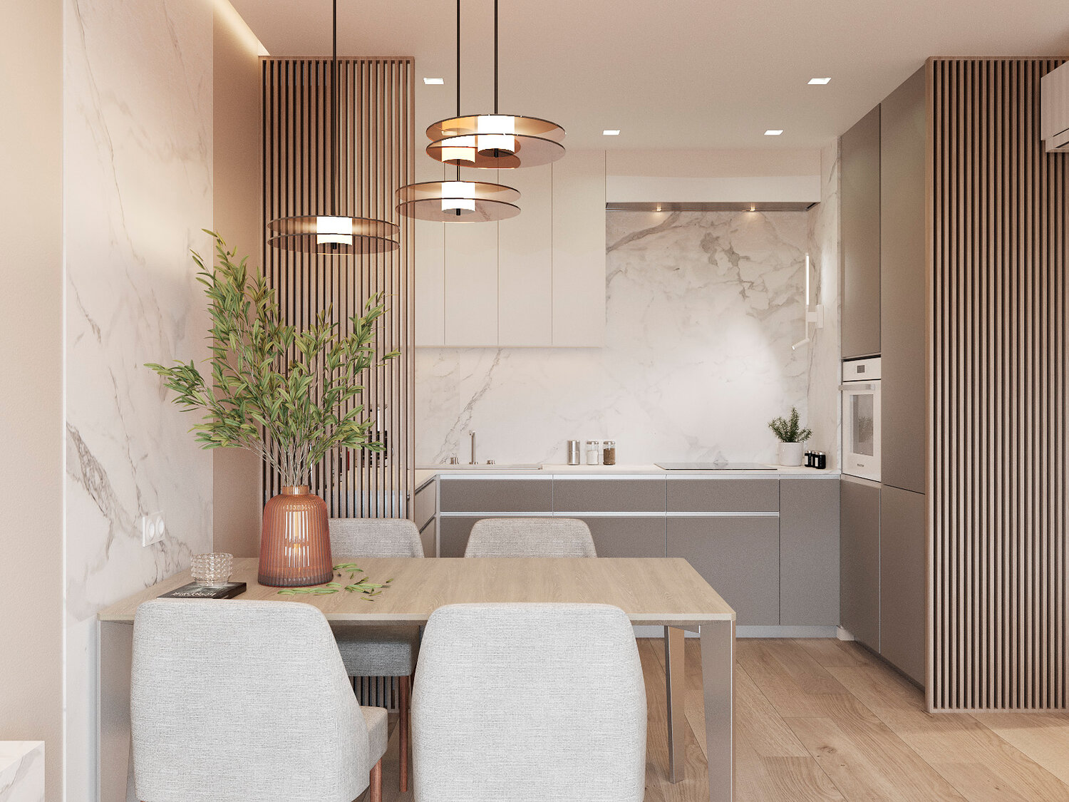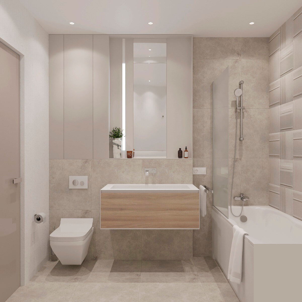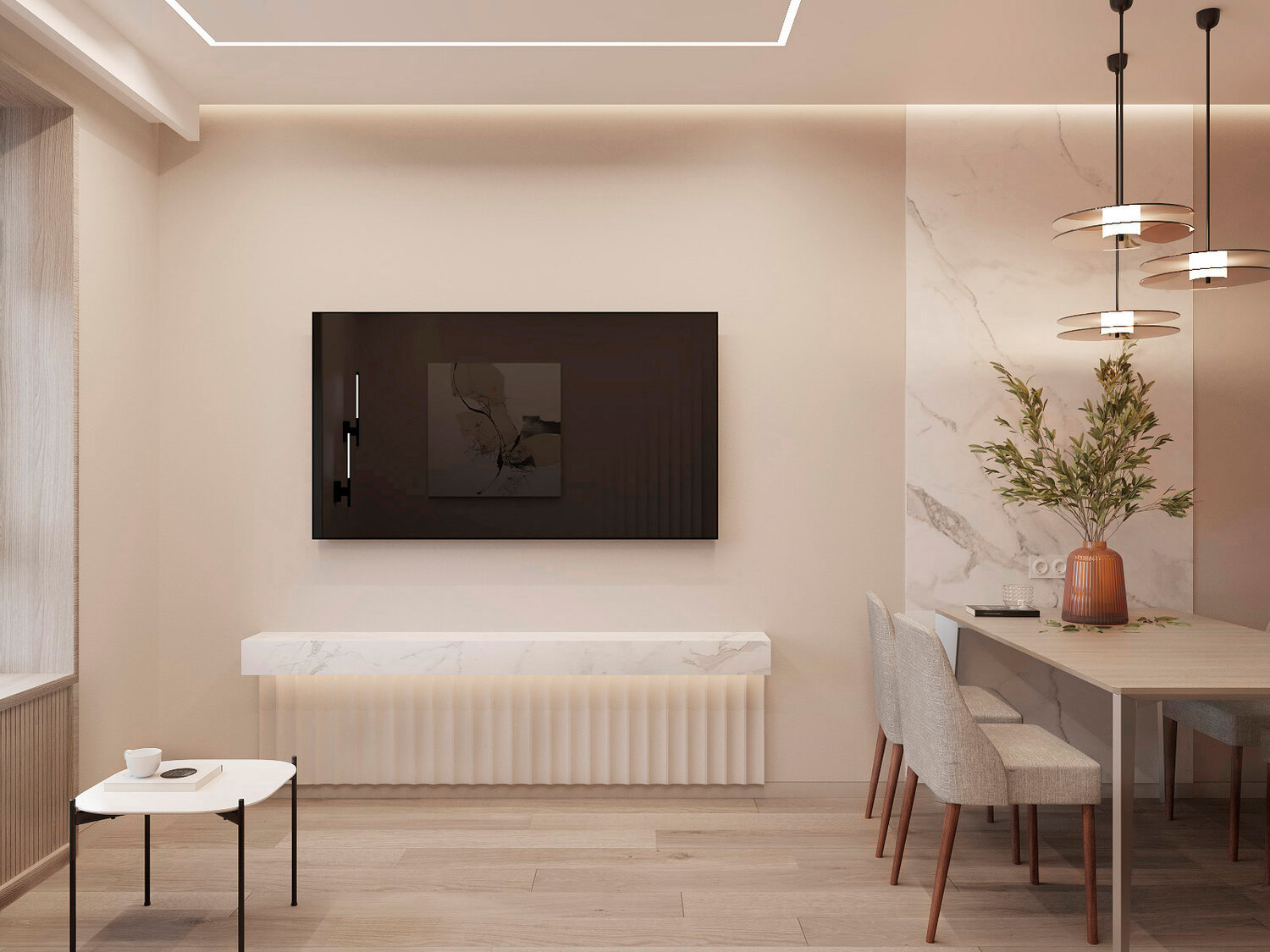 Дизайн-проект квартиры в современном стиле. Задача: создать современный интерьер с элементами неоклассики. Решения: - ровные природные цвета стен и текстуры - для комфортного размещения разных функциональных зон применено минимум отдельно стоящей мебели и максимум встроенной - разнообразный сценарий освещения