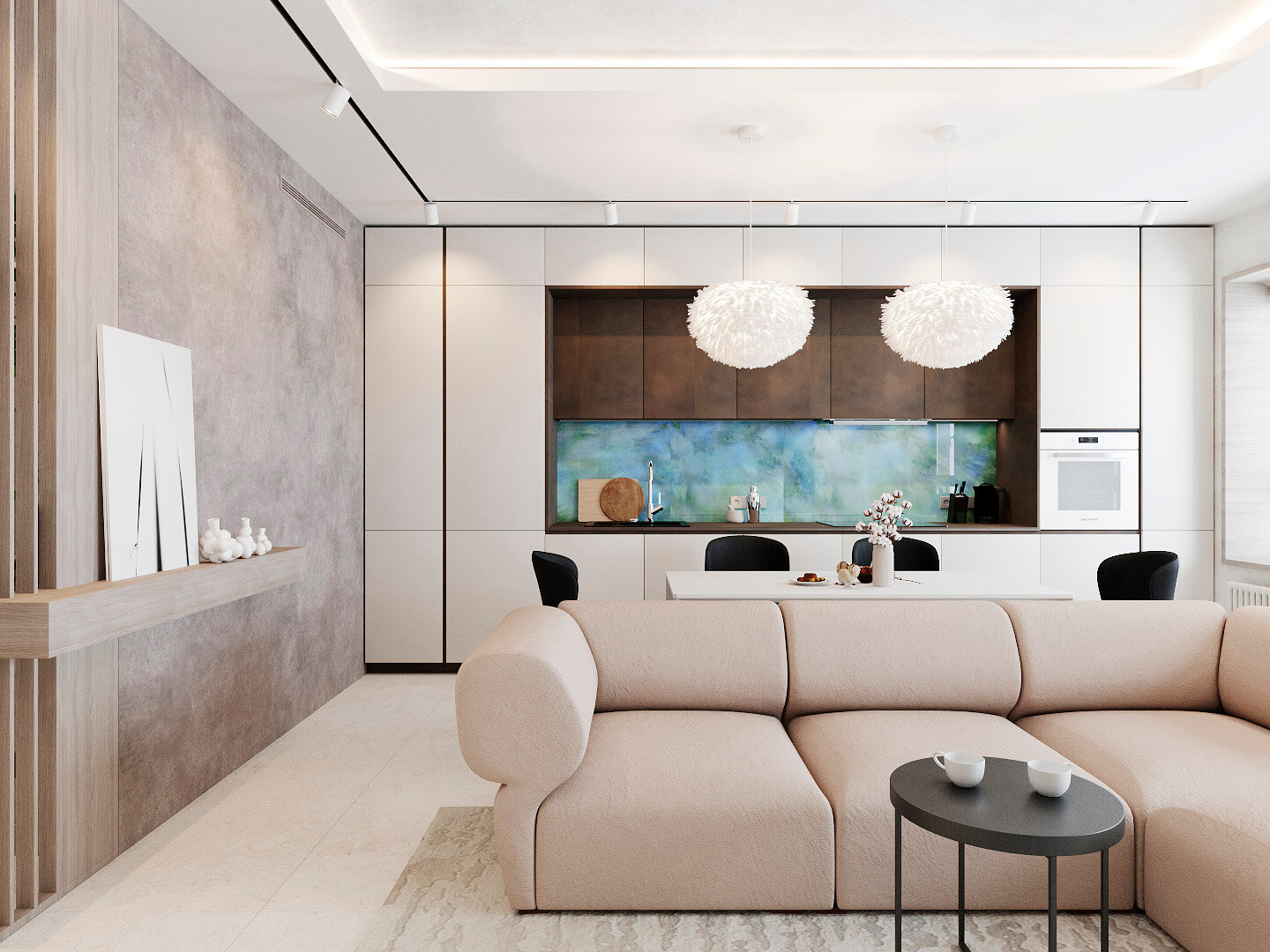 Задача: сформировать современный интерьер квартиры для молодой семьи с двумя детьми. Решения: - объединено пространство кухни-гостиной - максимально использованы площадь кухни, вместительные шкафы и встроенная мебель - интерьер решен в спокойных природных оттенках и текстурах с использованием черных контрастных пятен - выполнен разнообразный сценарий освещения