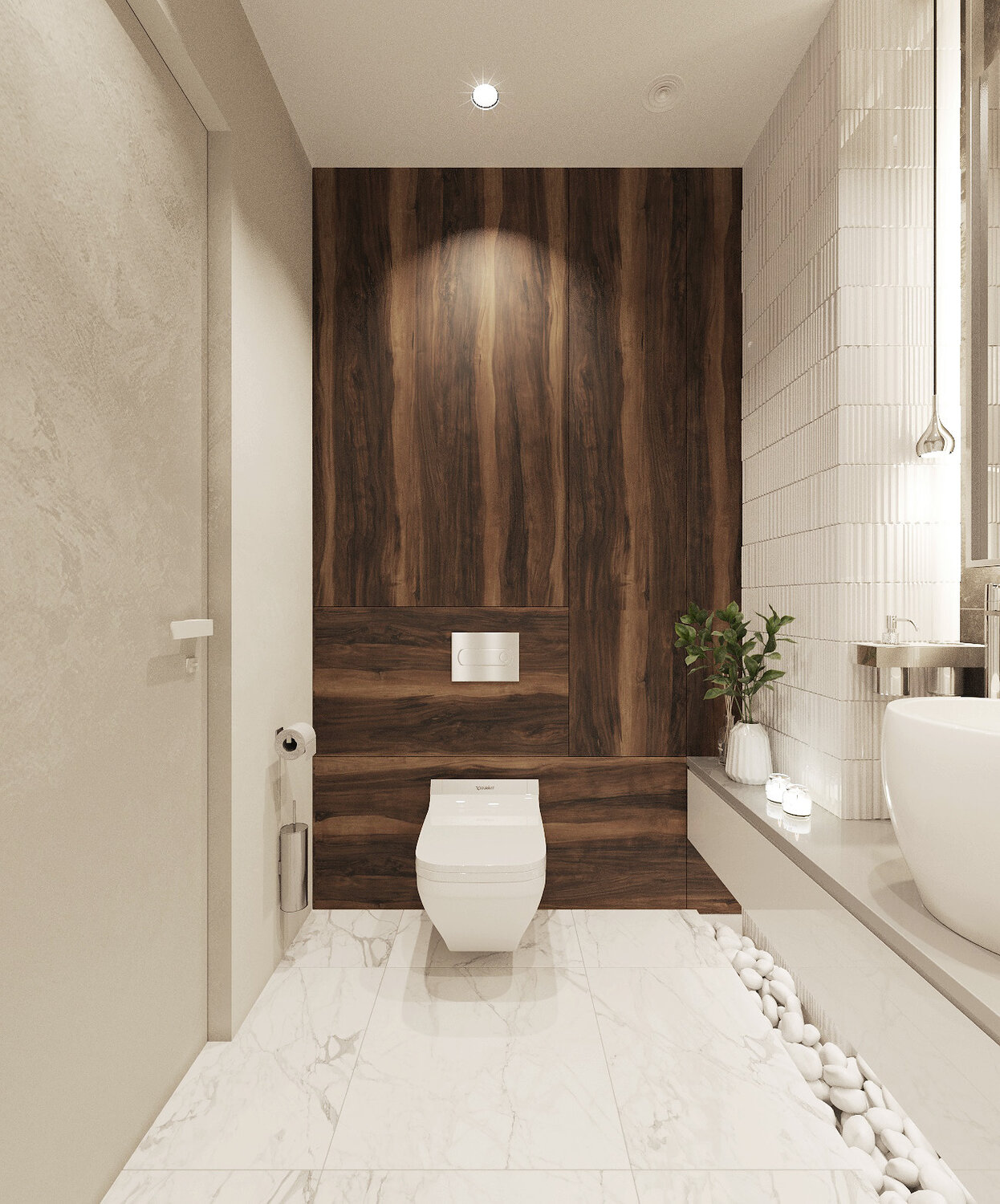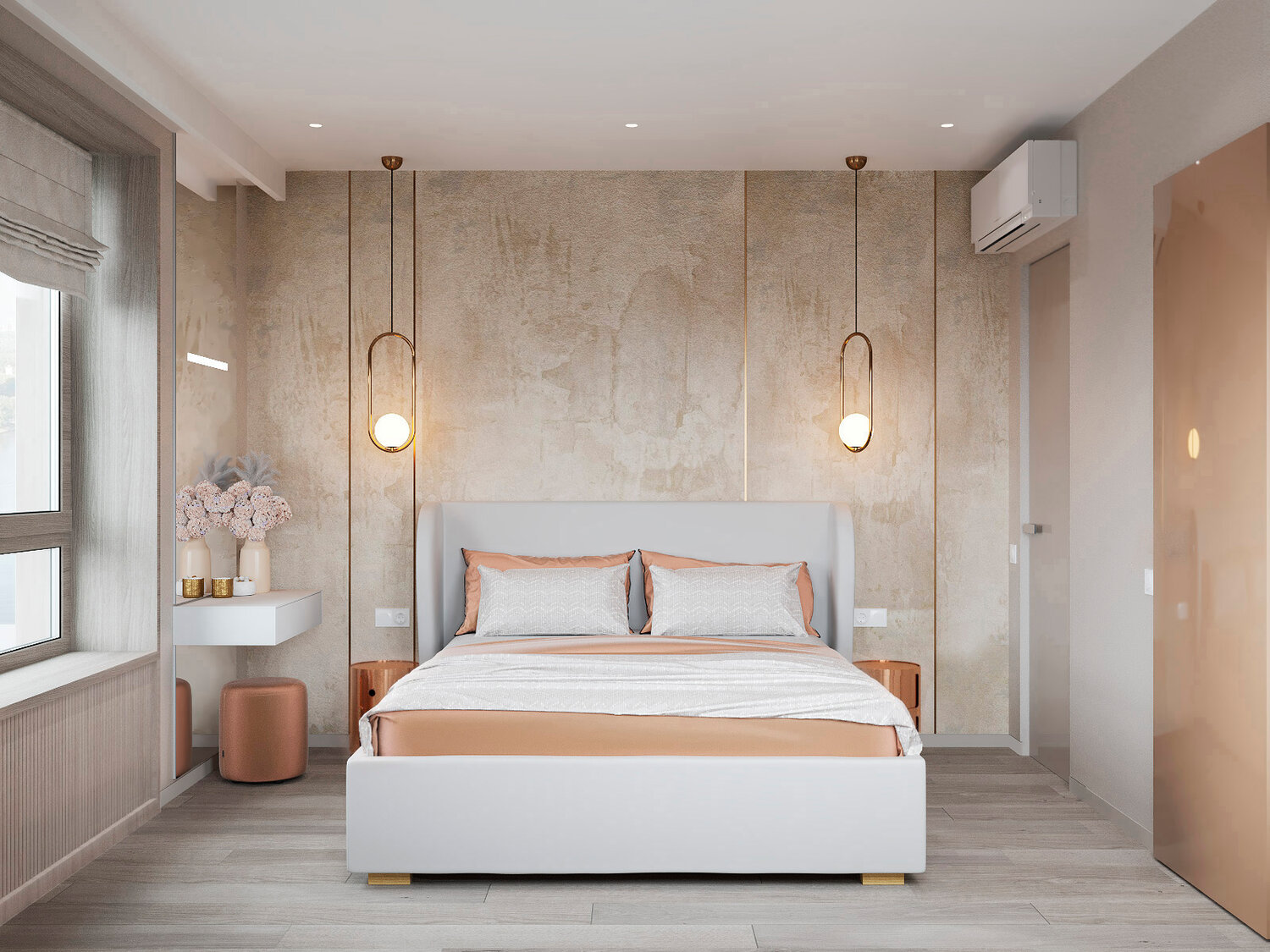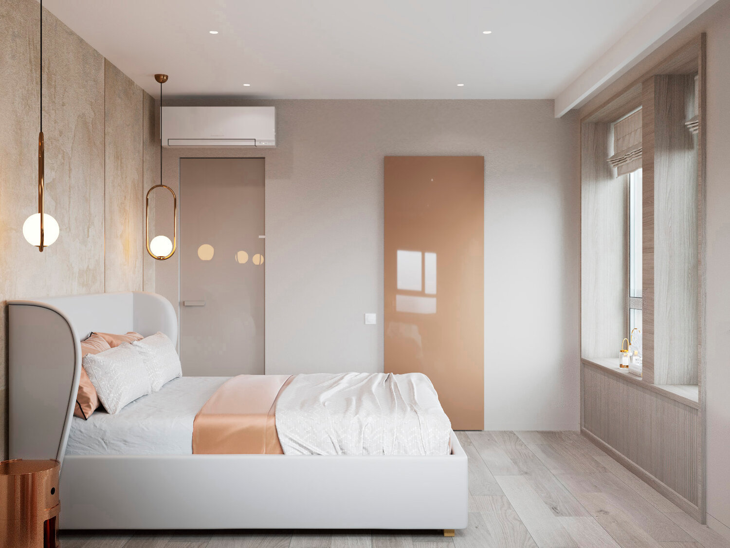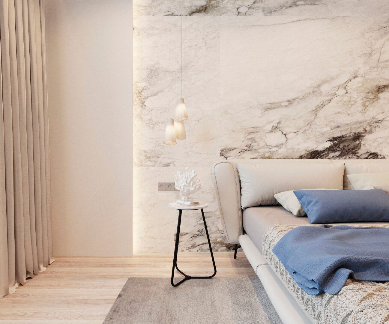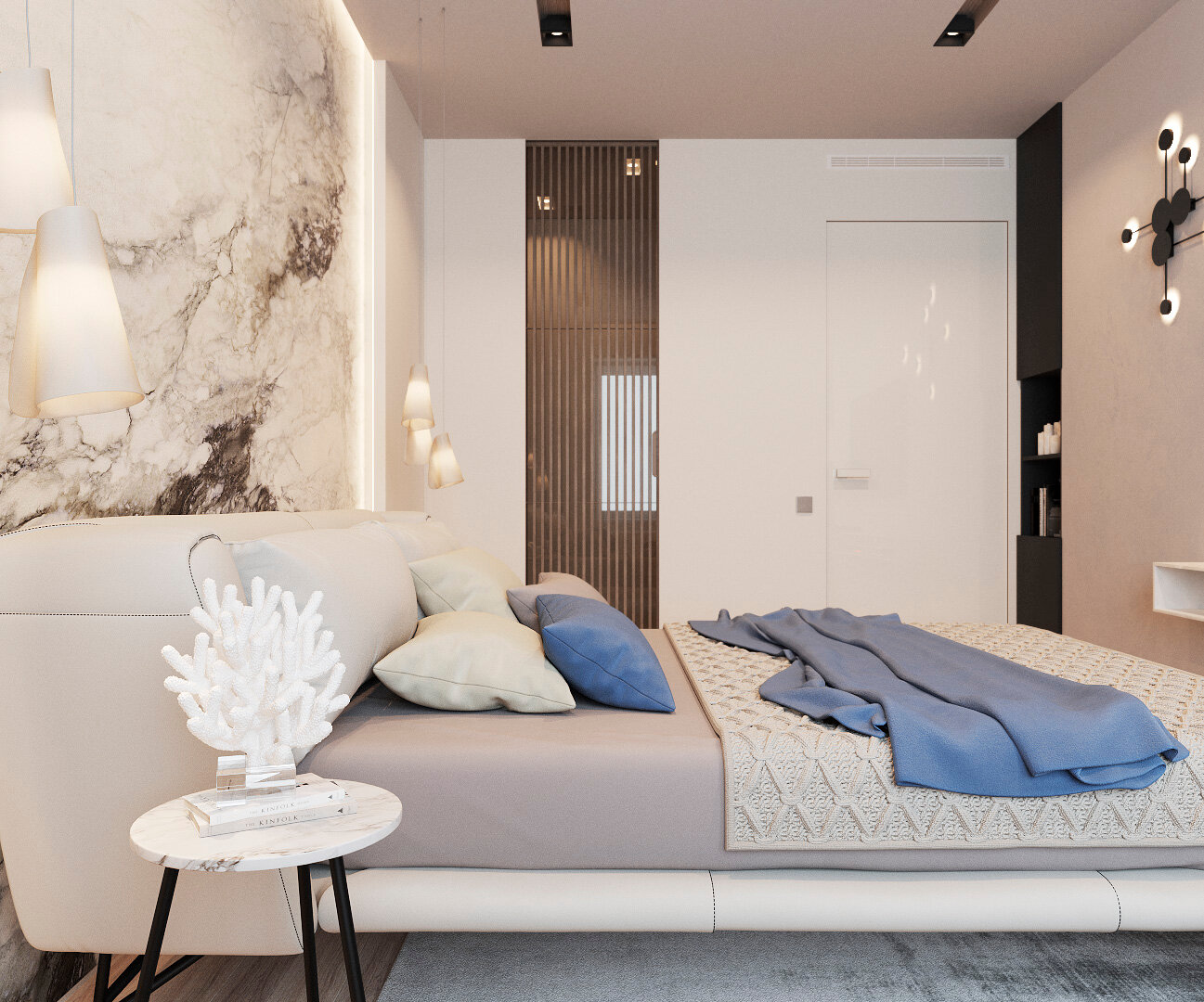 Дизайн интерьера выполнялся для молодой семьи с ребенком в современном стиле минимализм. Основной стояла задача создания интерьера без визуального шума, в спокойных тонах и с природными текстурами. Обилие разного освещения тоже играло большую роль, поэтому в проекте были предусмотрены разные сценарии освещения. При разработке мебели также во главу угла ставилась ее функциональность и не броскость объемов.