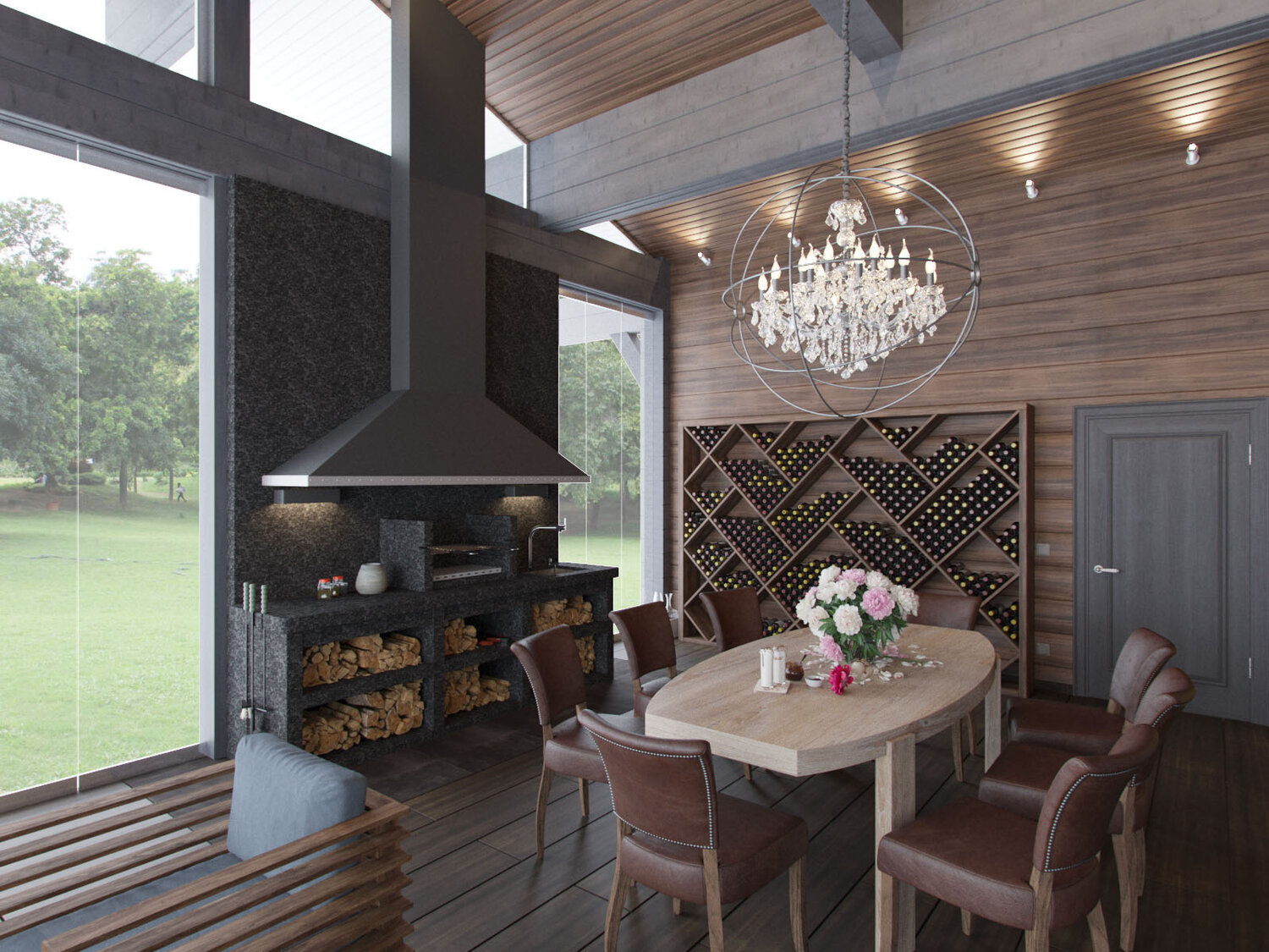 Дизайн дома из клееного бруса 450м.кв. разрабатывался для молодой семьи с двумя детьми для постоянного проживания. Главной задачей проекта было выполнить интерьер в стиле неоклассики, выражая его через природные оттенки и фактуры - залог гармонии с окружающим живописным ландшафтом. Хозяева дома желали, чтобы в основном преобладали темные оттенки серого и коричневого. Поэтому было решено основные объемы пространства решить в этих цветах, а белый цвет применить в деталях, который бы их подчеркивал и придавал выразительный контраст в интерьере.
