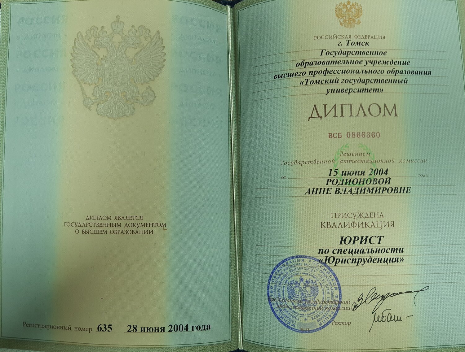 Образование: Томский Государственный Университет (г. Томск), специальность юриспруденция, обучение 1998 -2004