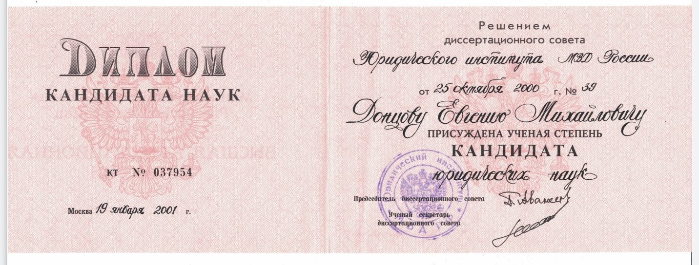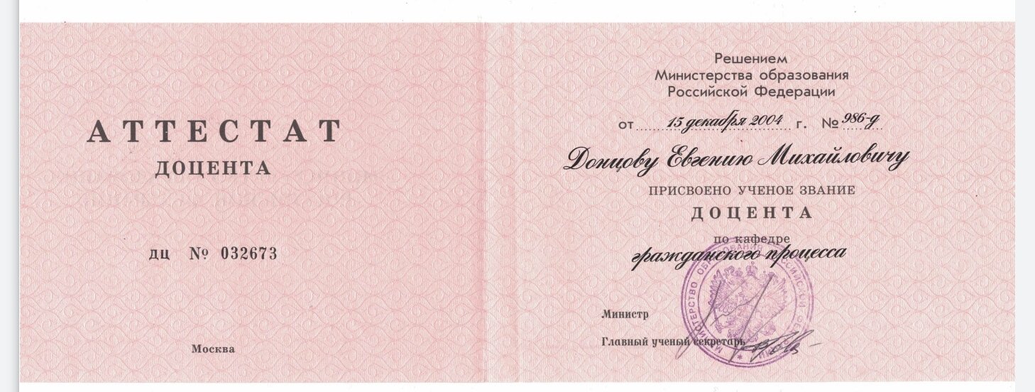 Позвольте представиться: моё имя - Евгений Михайлович Донцов. Я опытный юрист с более чем 35-летним стажем работы в юридической сфере. Обладаю ученой степенью кандидата юридических наук и званием доцента.