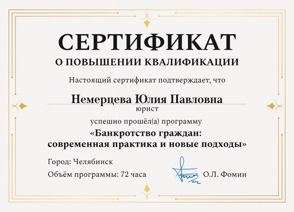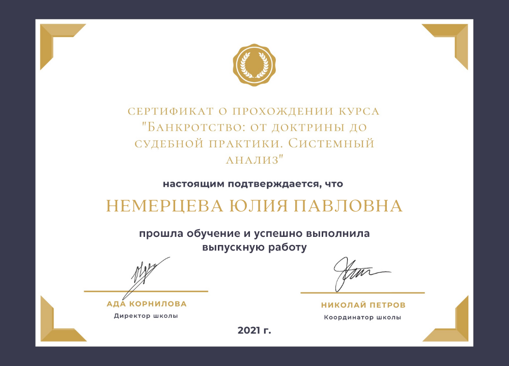Занимаюсь юридической практикой более 5 лет. Имею большой опыт работы в сфере банкротства.